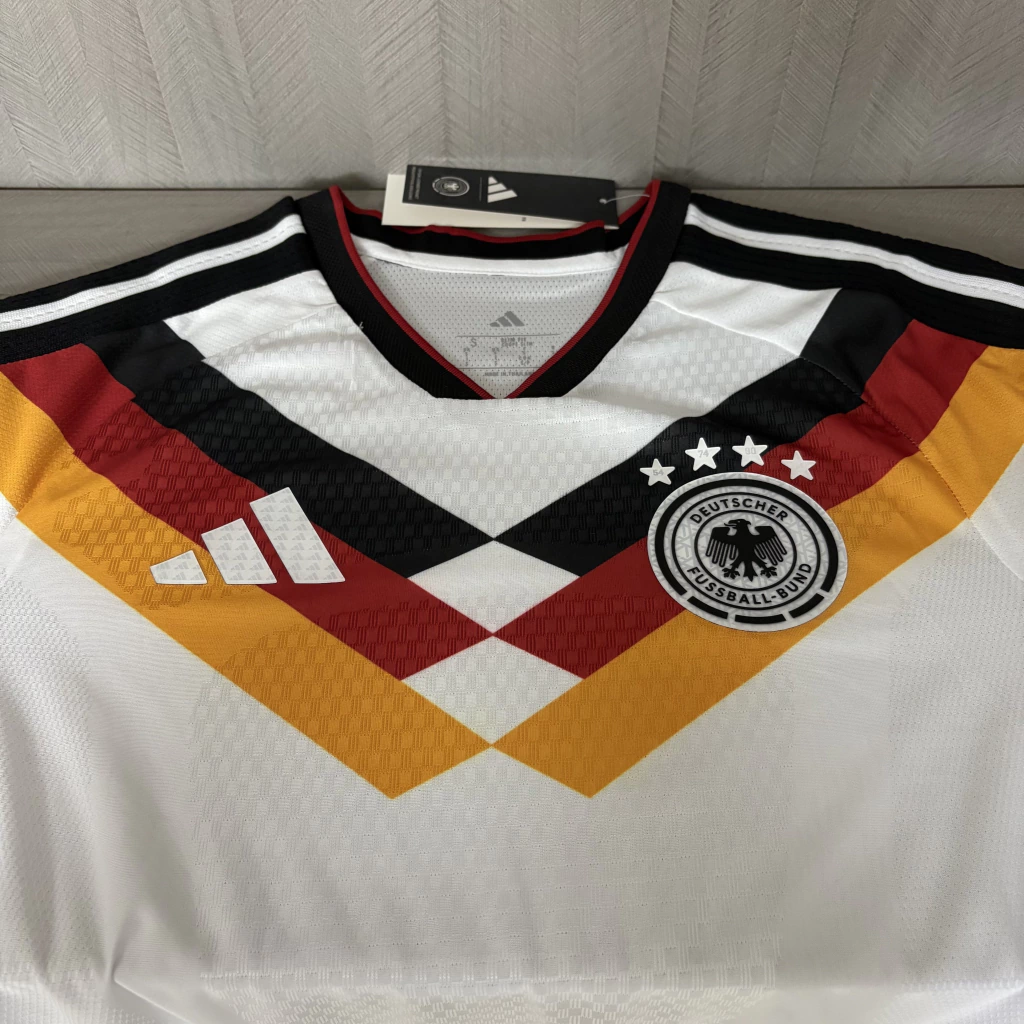 VERSÃO JOGADOR: A nova camisa titular da seleção tetracampeã do mundo traz o tradicional branco como cor base e tem como destaque um chevron, que liga as mangas e o peitoral, em três faixas nas cores da bandeira nacional, uma mistura entre os designs dos últimos dois títulos da seleção (1990 e 2014).